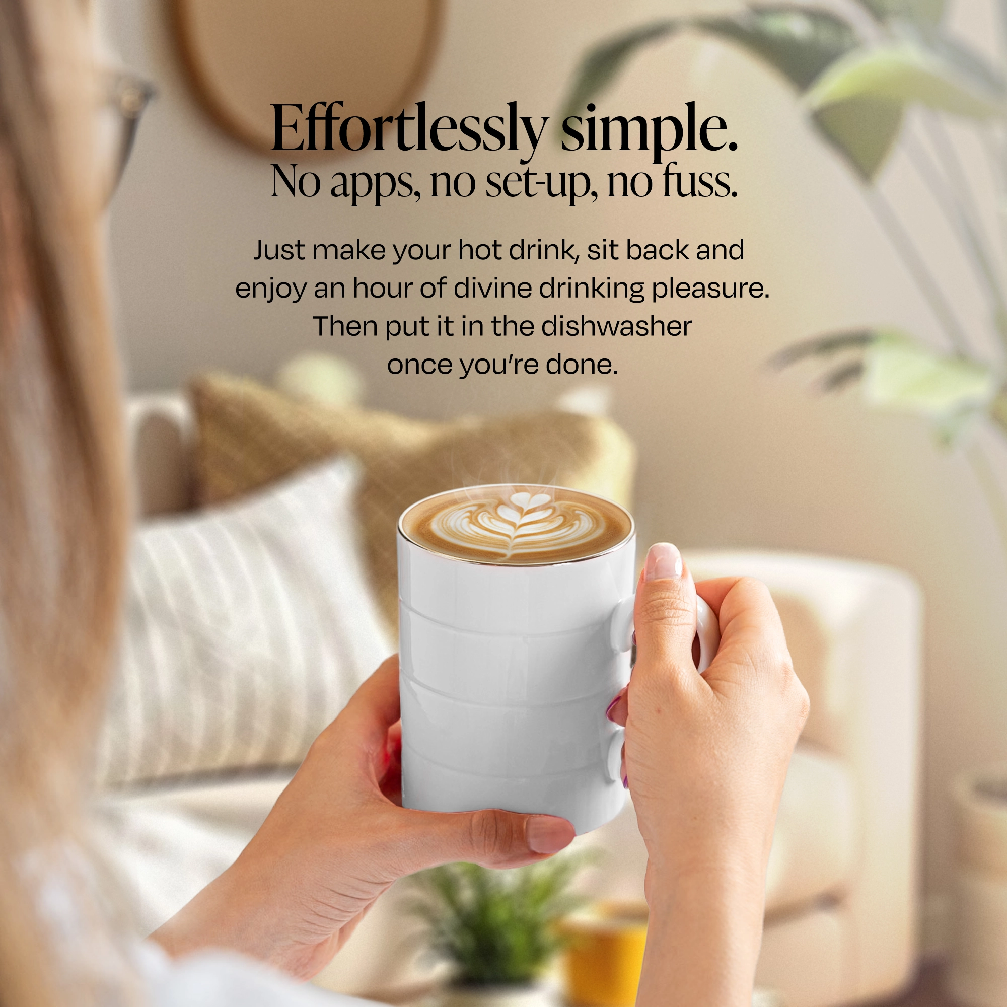 The Glowstone Mug automatically heats when filled and turns off once empty — no buttons, no fuss. Its sealed, dishwasher-safe design keeps components protected, ensuring long-lasting performance and effortless cleaning.