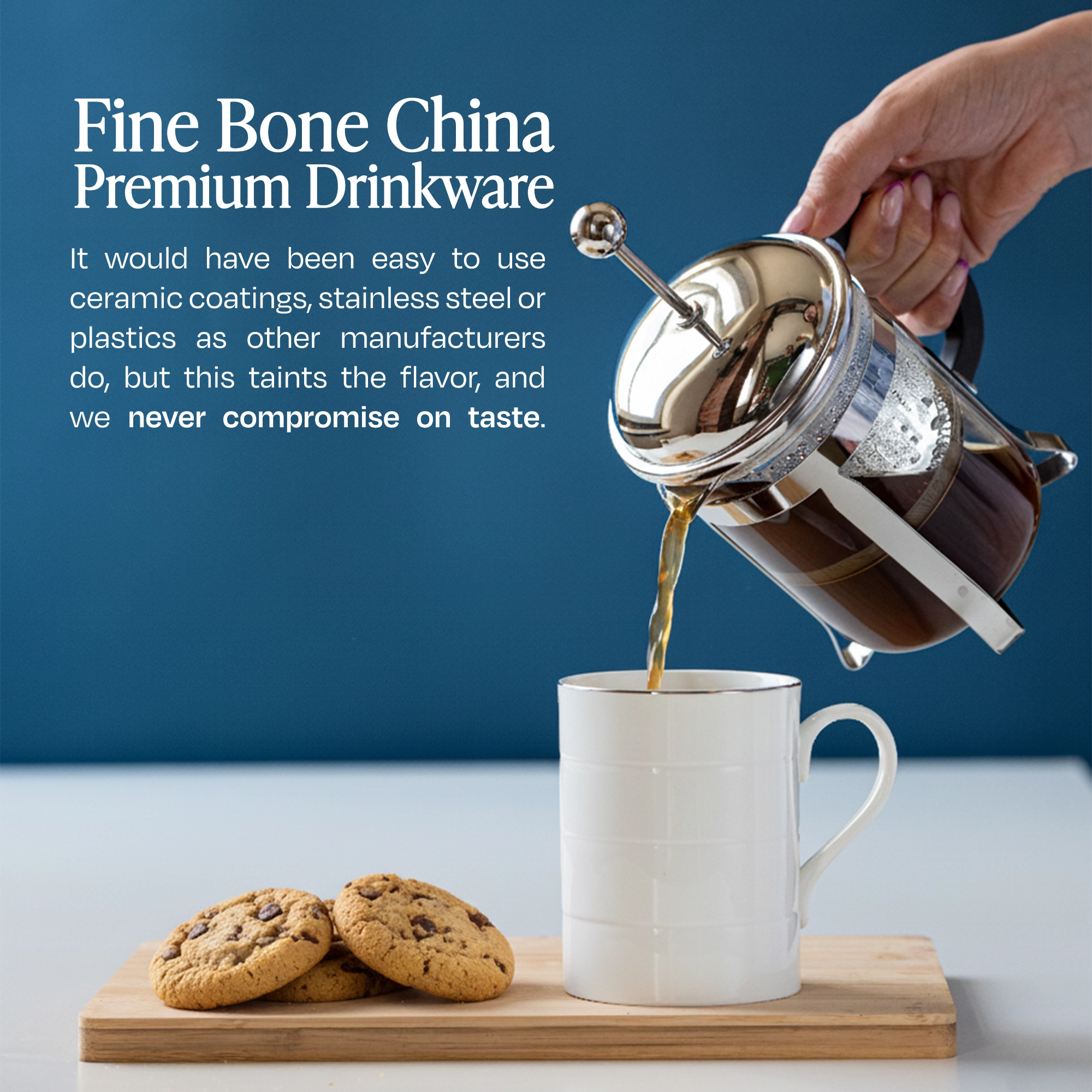 Fine Bone China enhances flavour naturally — unlike metal or plastic mugs, it doesn’t absorb tannins or alter taste. The result? A pure, full-bodied drink that reflects the craftsmanship behind every Glowstone mug.